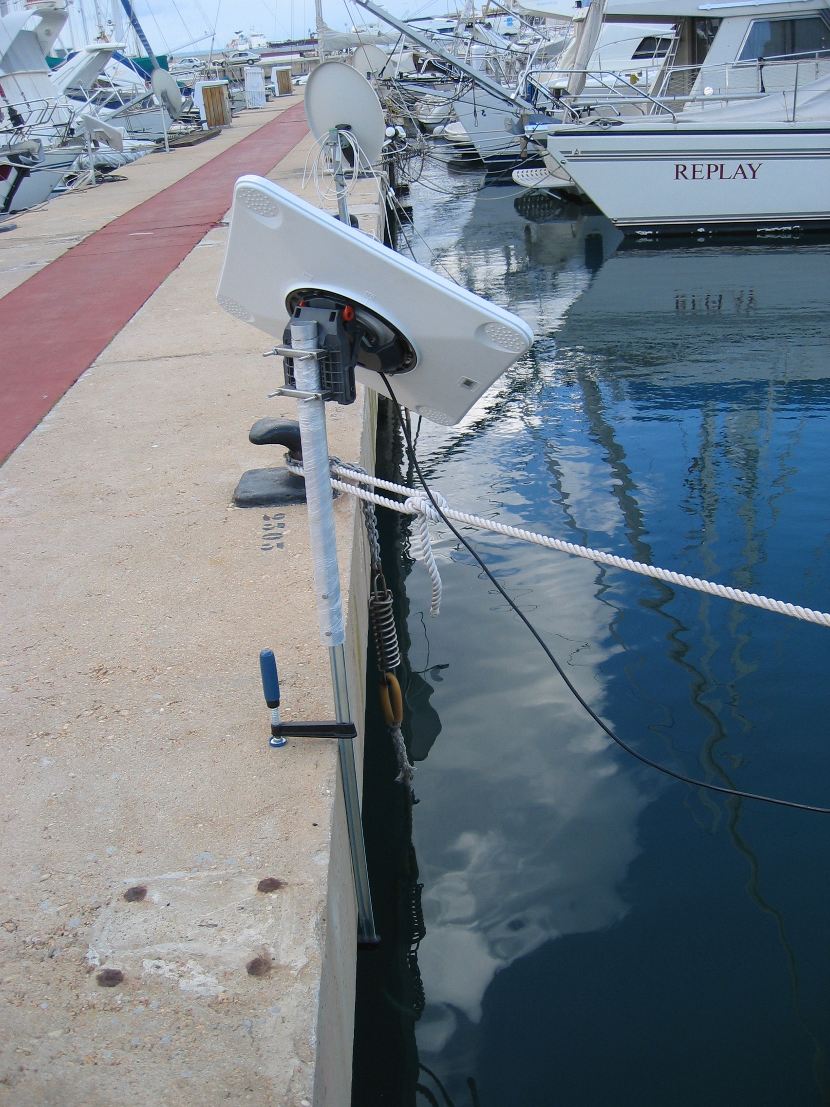 Die Satantenne ist mobil mit einer langen Schraubzwinge an der Pier befestigt und braucht nicht permanent an der Pier montiert werden.